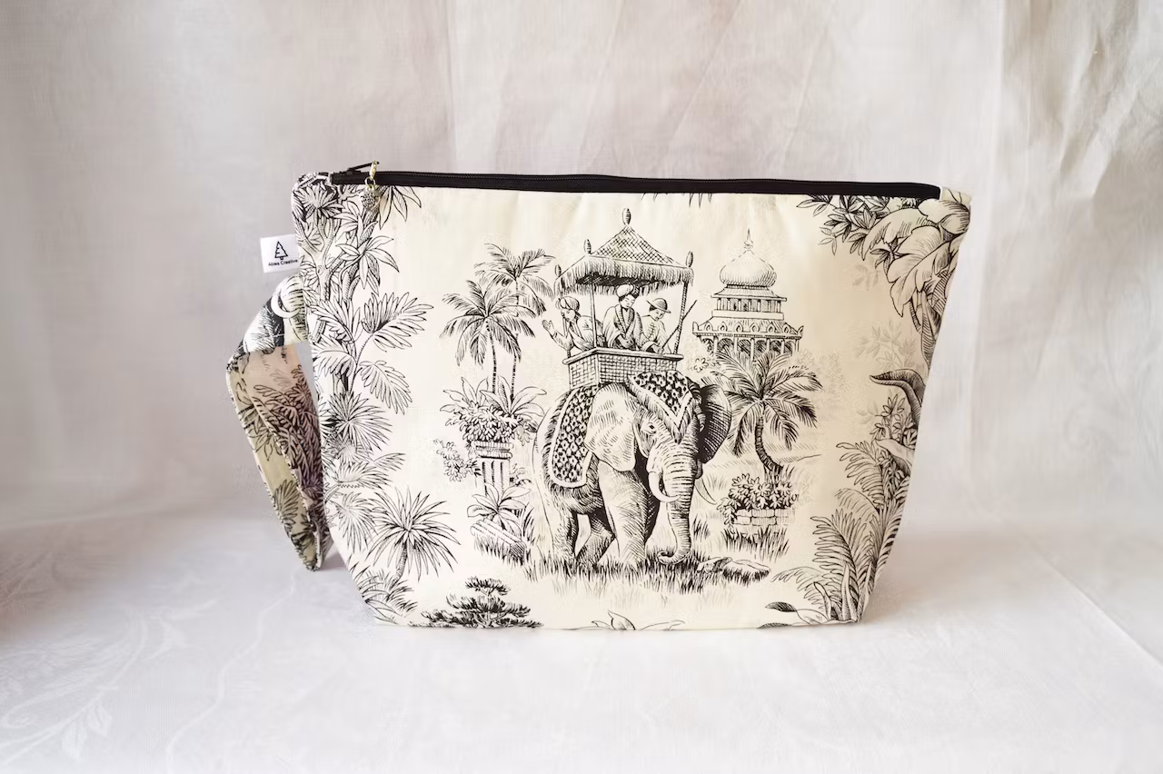 Projektväskor i ett härligt bomullstyg med en stor elefant på framsidan. Baksidan är gjord i mörkt rosalila linnetyg. Väskorna är helfodrade och har 2-3 fickor.